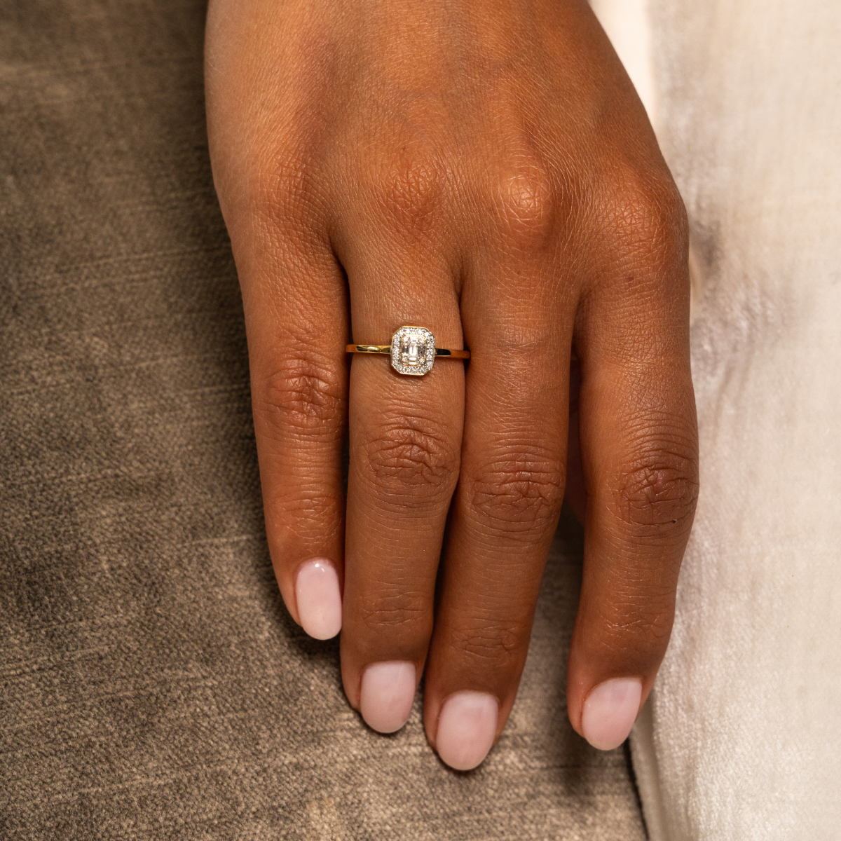 Cette bague en or jaune 18 carats affiche un style contemporain et épuré, sublimé par l'éclat de ses diamants. Un anneau fin et lisse met en valeur un motif central géométrique, où plusieurs diamants de taille similaire sont harmonieusement sertis. Ce pavage de diamants crée un effet de lumière scintillante, apportant une brillance subtile et raffinée à la bague.