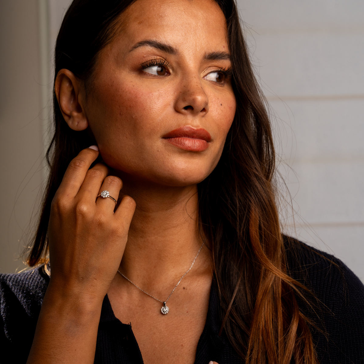 Ce collier en or blanc 18 carats arbore un pendentif délicat et féminin, évoquant la grâce d'une fleur épanouie. Un diamant central étincelant est entouré d'un halo de 9 diamants plus petits, sertis avec précision pour créer une fleur scintillante. Sa chaîne fine et raffinée, réglable grâce à un anneau intermédiaire pour s'adapter à toutes les envies.