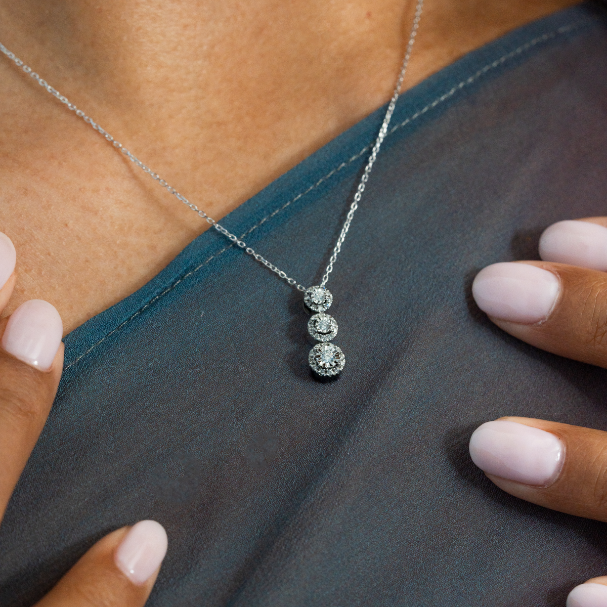 Ce collier élégant en or blanc 18 carats présente un design raffiné et étincelant avec une cascade de trois diamants centraux, chacun sublimé par un halo de diamants plus petits. Sa chaîne fine et délicate met en valeur la beauté du pendentif, créant un ensemble harmonieux et féminin. Sa chaîne, d'une longueur ajustable de 38 à 42 cm grâce à un anneau pratique, permet de l'adapter à vos envies.