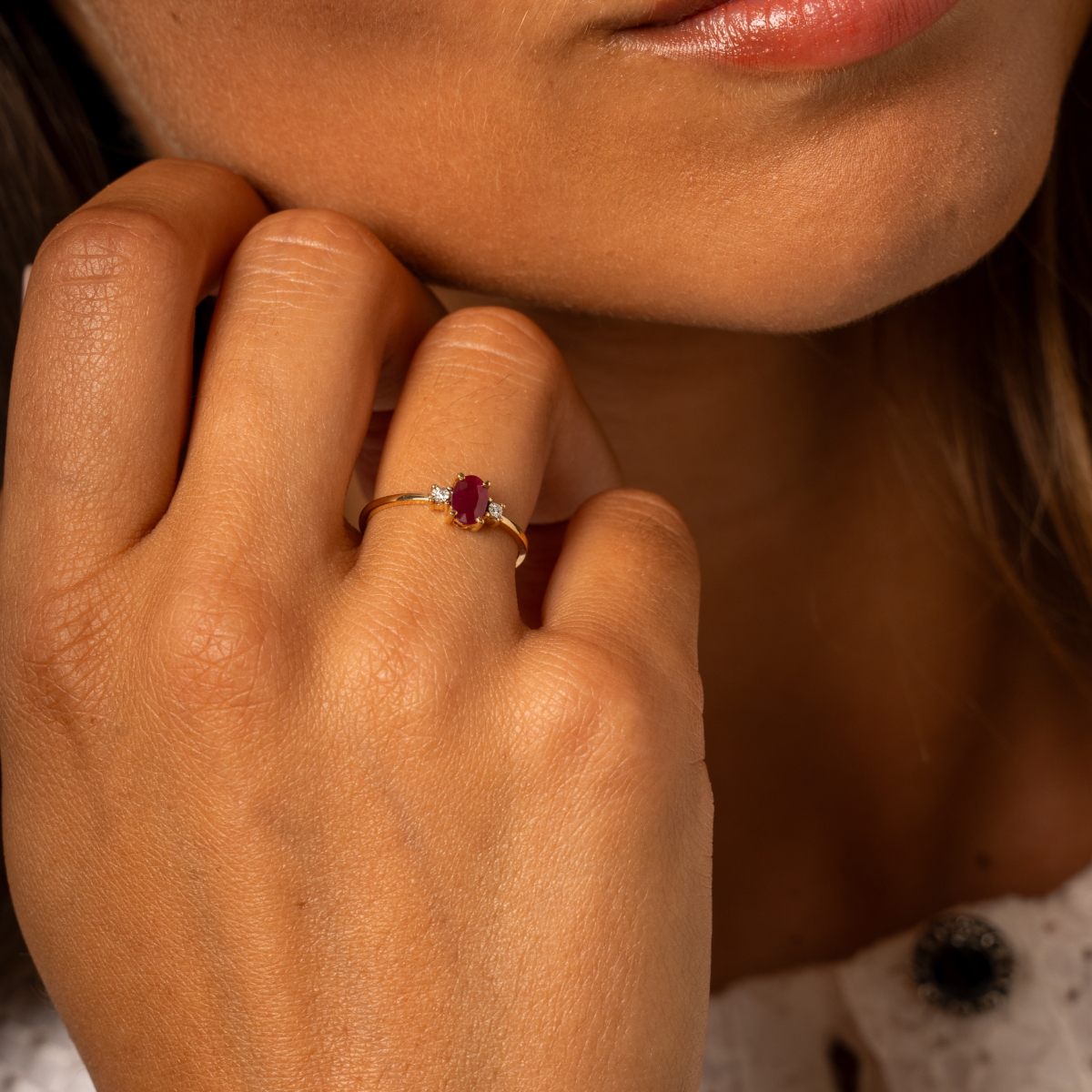 Cette bague en or jaune 18 carats resplendit de l'éclat envoûtant d'un rubis ovale, véritable trésor de la nature. Sa couleur rouge profonde, symbole d'espoir et de renouveau, est mise en valeur par un sertissage délicat qui la laisse s'exprimer pleinement. De part et d'autre de cette pierre majestueuse, deux diamants étincelants ajoutent une touche de lumière et de sophistication. Le tout repose sur un anneau fin et élégant, en parfaite harmonie avec l'ensemble.