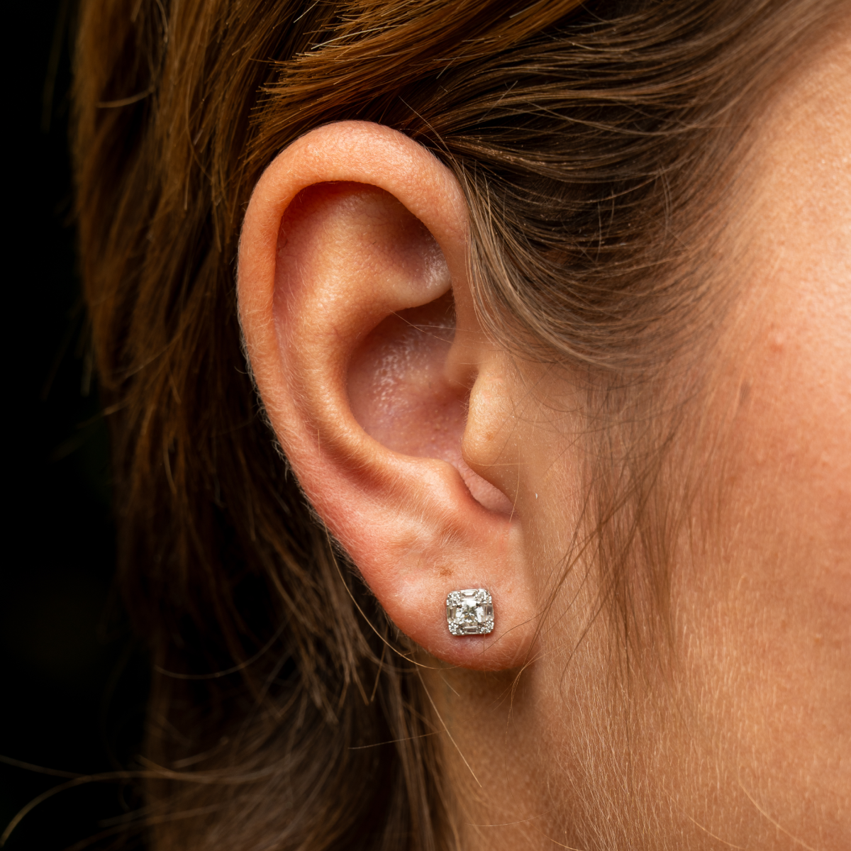 Ces élégantes boucles d'oreilles en or blanc 18 carats présentent un design carré raffiné, mettant en valeur un diamant central étincelant, entouré de diamants plus petits de différentes tailles et formes. L'association de diamants taille brillant et de diamants taille baguette crée un jeu de lumière captivant. De plus, leur poids plume assure un confort optimal tout au long de la journée.