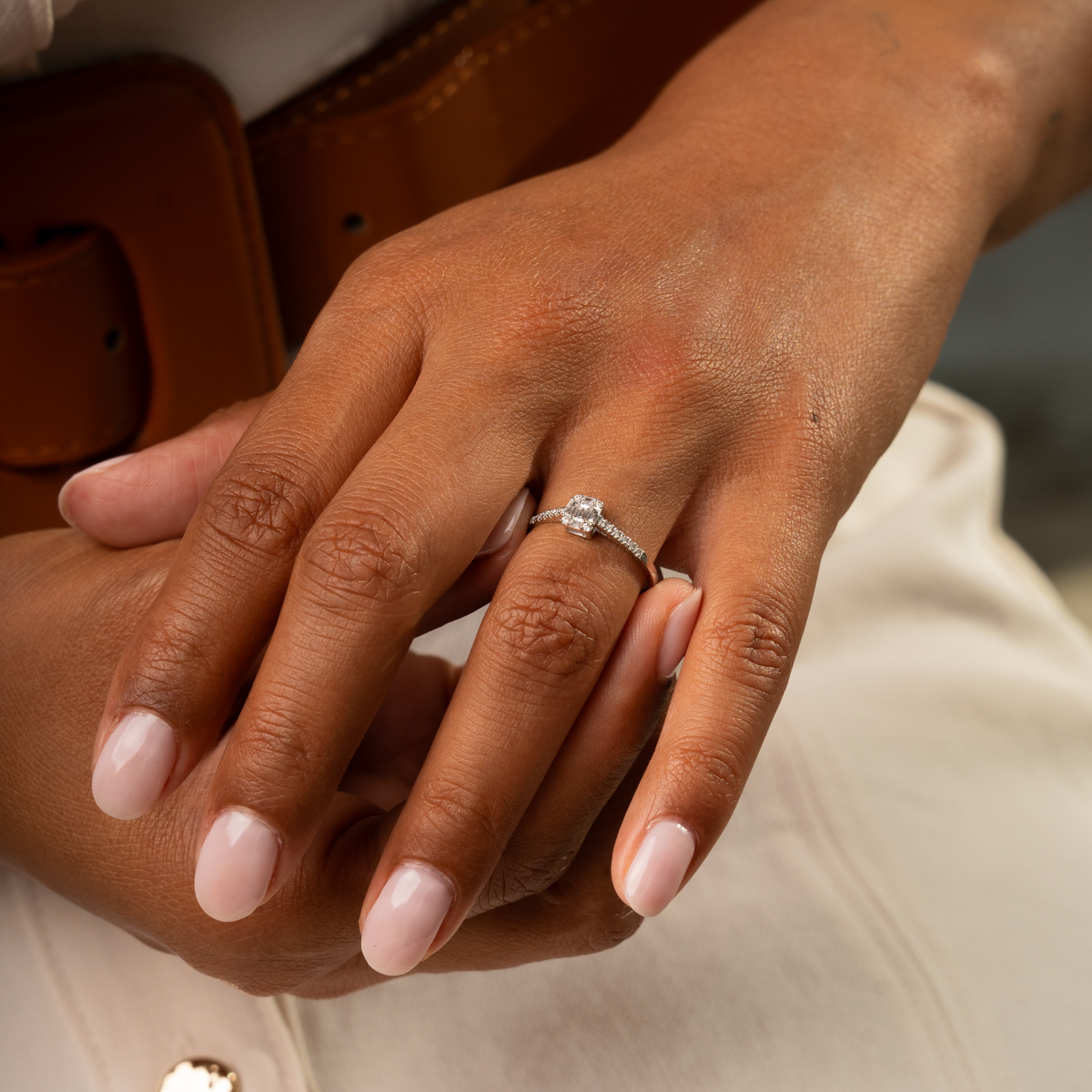 Cette délicate bague de fiançailles en or 18 carats présente un design élégant et raffiné, orné de multiples pierres précieuses. L'ensemble crée un effet scintillant et sophistiqué, parfait pour symboliser un engagement amoureux.