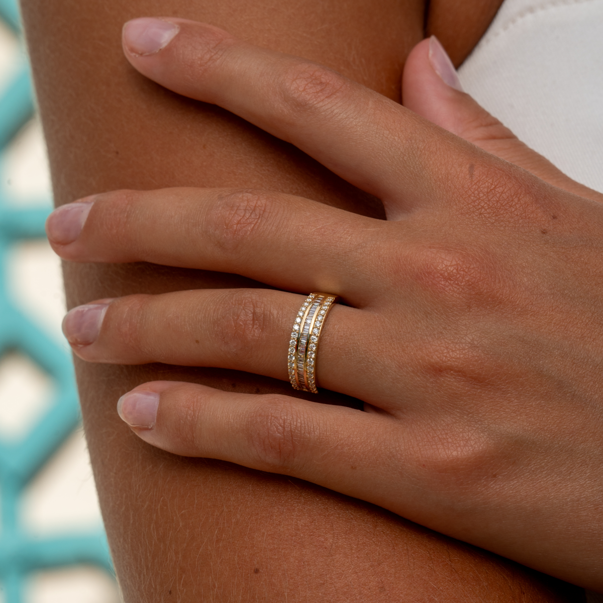 Illuminez votre style avec cette bague en or jaune 18 carats, véritable ode à l'élégance. Son pavage de diamants étincelants, disposés en trois rangées harmonieuses, capture la lumière à chaque mouvement, créant un spectacle fascinant. Deux rangées de diamants ronds encadrent une ligne centrale de diamants baguette, offrant un contraste subtil et raffiné. Chaque détail de cette bague respire le luxe et le savoir-faire, faisant de ce bijou un choix parfait pour les grandes occasions ou pour ajouter une touche d'éclat à votre quotidien.