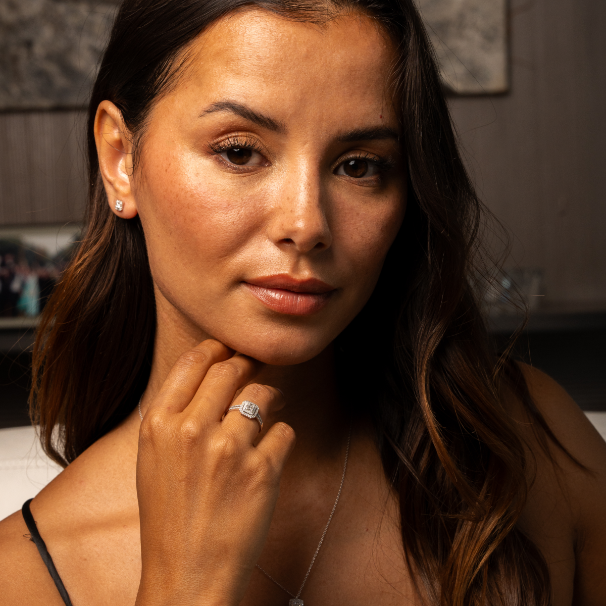 Cette somptueuse bague en or blanc se distingue par un halo éblouissant de diamants entourant un motif central géométrique. Les diamants sont soigneusement disposés pour maximiser leur éclat, tandis que le double anneau pavé ajoute une touche supplémentaire de brillance. Un bijou captivant qui allie sophistication et élégance moderne.