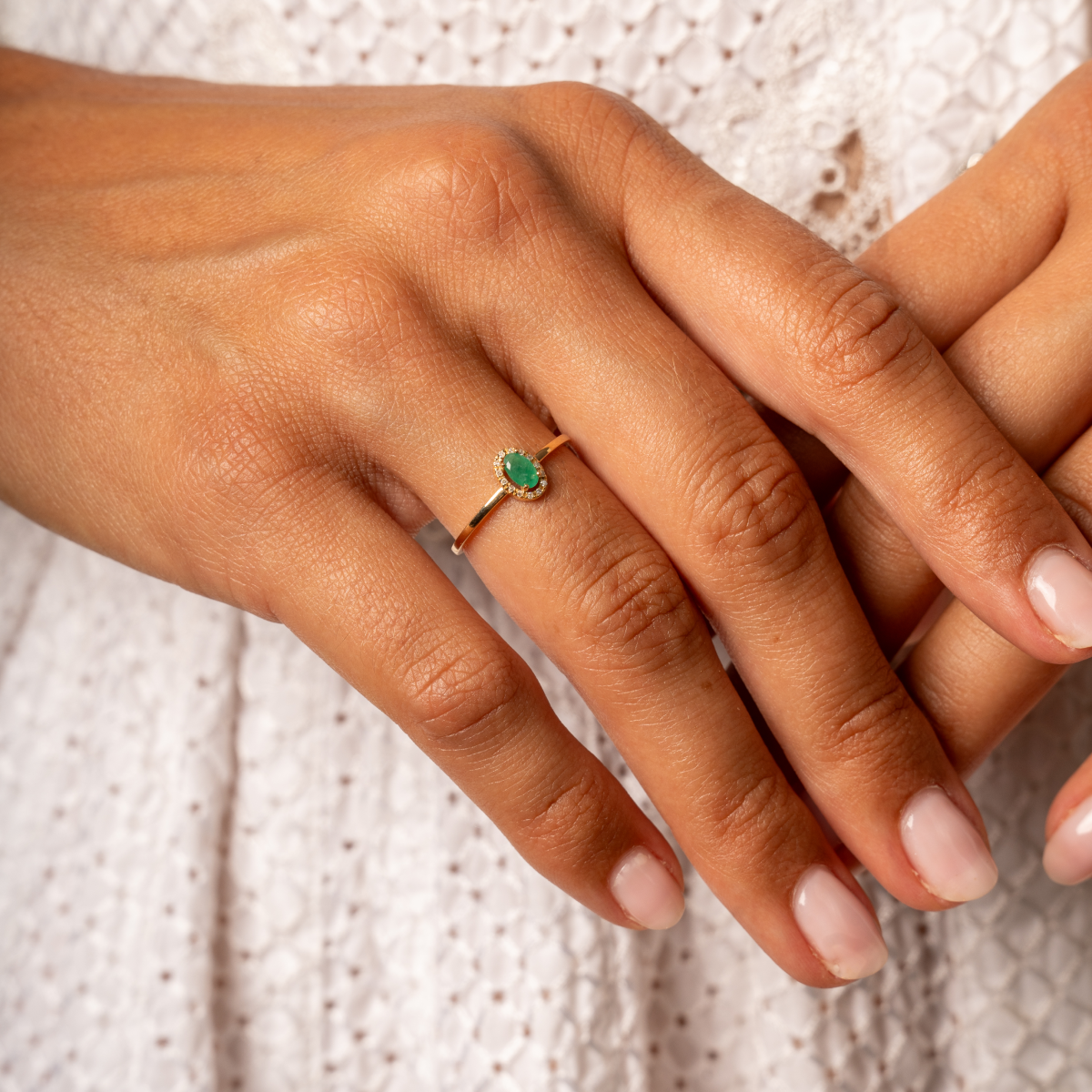 Cette bague en or jaune 18 carats rayonne d'une élégance classique grâce à son émeraude ovale centrale, véritable trésor de la nature. Sa couleur verte profonde, symbole d'espoir et de renouveau, est sublimée par un halo étincelant de diamants. Ce sertissage délicat met en lumière la beauté de l'émeraude tout en ajoutant une touche de sophistication. L'anneau fin et lisse complète harmonieusement l'ensemble, offrant un écrin de simplicité à cette composition précieuse