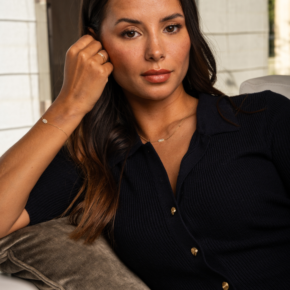 Ce bracelet en or jaune 18 carats présente un motif central élégant et raffiné, de forme rectangulaire allongée. Le motif est orné de 21 diamants scintillants, disposés en trois rangées parallèles qui créent un effet de lumière éblouissant. Sa chaîne fine et raffinée, réglable grâce à un anneau intermédiaire, permet de l'adapter à tous les poignets. Ce modèle est également disponible en collier et en bague assortis, permettant de créer une parure complète et harmonieuse.